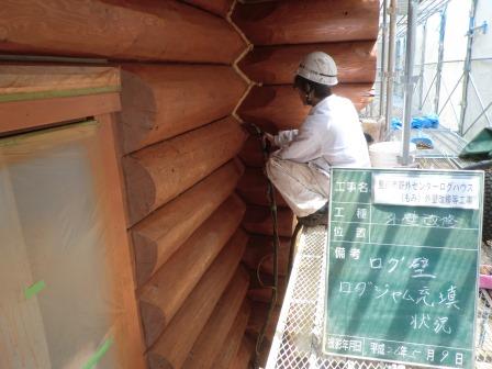 太陽光線や雨、カビ、コケ等の防止効果のある染料(キャプチャー)を使ってログ材の表面に色素浸透させます。